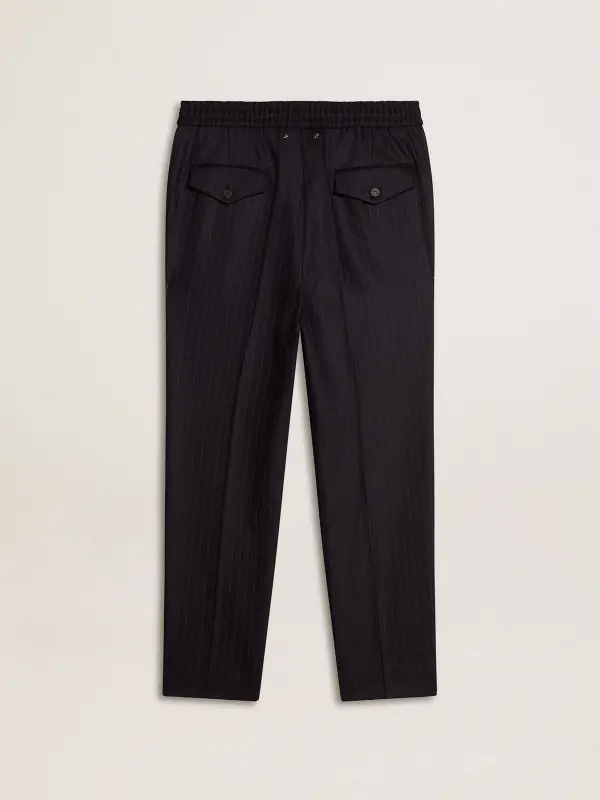 The third drop in our Fall/Winter 25 collection channels the funky glamor of the 1970s, a time when the night transformed into a canvas for unapologetic self-expression. These men's pants in navy blue wool with an elasticated waist feature a tailored fit with thin stripes. The loose leg and double star on the back add the finishing touch.