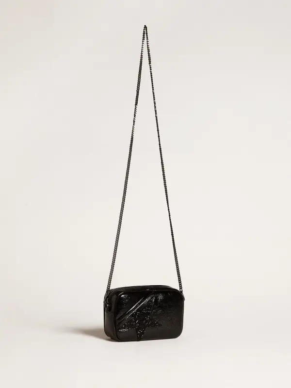 Vintage inspiration, metropolitan attitude. A versatile accessory that captures the classic design of camera bags and stands out thanks to its refined details – now also in a mini version. This model, in black naplak leather, features a star decorated with tone-on-tone Swarovski crystals. The black shoulder chain and the contrasting silver logo that decorates the front complete the look.