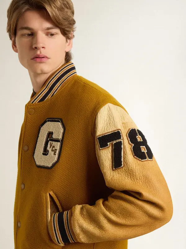 Inspired by the iconic Seventies, the carefree spirit of that era comes to life with the first drop of our Fall/Winter 25 collection. Made of ochre yellow wool with beige leather sleeves, this distressed bomber jacket features an embroidered thread patch on the front, ribbed cuffs and hem, and a snap button fastening. Two central pockets add the finishing touch.