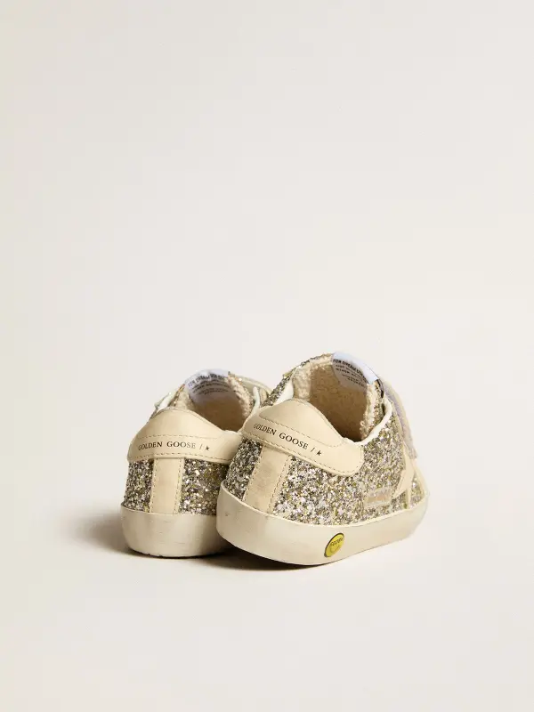 Our Old School sneakers feature two Velcro straps in cream-colored leather on the front with contrasting logo. With a platinum-glitter upper, the Junior version of this model features cream leather inserts, including the star and heel tab. The smiley detail on the foxing adds the finishing touch.