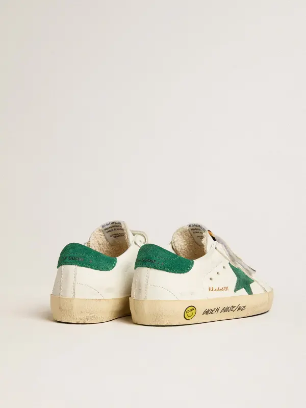 Our Old School sneakers feature two Velcro straps on the front with contrasting logo. The Junior version of this model in white leather features a green suede star and heel tab. The smiley detail and contrasting lettering on the foxing add the finishing touch.