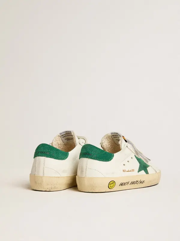 Our Old School sneakers feature two Velcro straps on the front with contrasting logo. The Young version of this model in white leather features a green suede star and heel tab. The smiley detail and contrasting lettering on the foxing add the finishing touch.