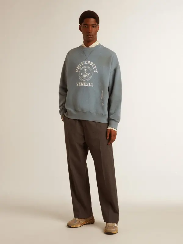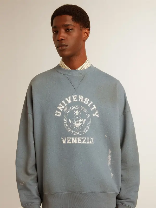 A love story to our home, Marghera. Where everything began. Our latest collection reflects the spirit of our birthplace, its contrasts, industrial soul, and manufacturing landscapes, weaving together inspirations from both the vibrant energy of workwear and the refined essence of traditional tailoring. In baby blue and inspired by American college style, this unisex oversized sweatshirt features a distressed finish. The vintage “University of Venice” print, spraying detail and white distressing on the collar and cuffs make this sweatshirt a true one-of-a-kind.