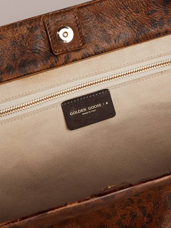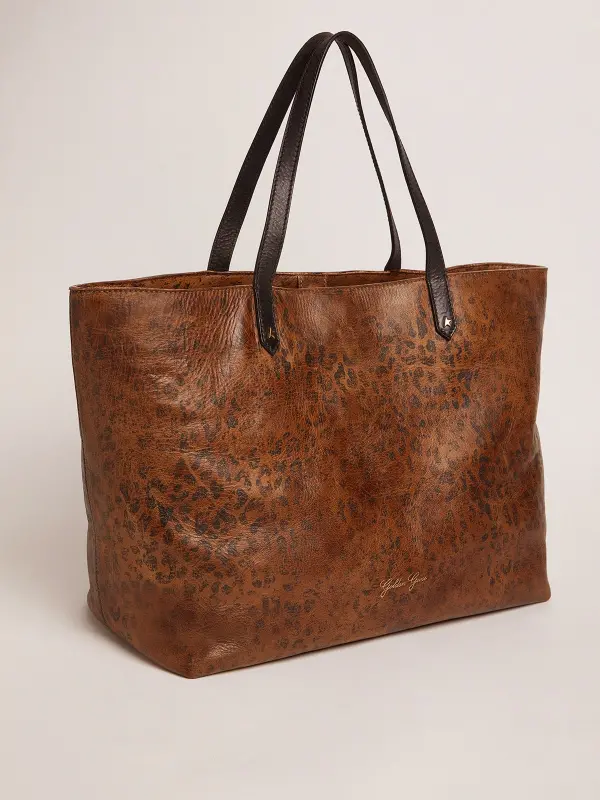 A diary in which to write your own story, your companion for everyday experiences and adventures. Made in Italy from high-quality leathers, our Pasadena Bag lives and evolves with you. Using an age-old vegetable tanning process, this finish does not contain chemical substances and preserves the natural appearance of the leather, making every bag different from the rest and simply unique. This hammered leather version features a leopard print and contrasting black double handles, decorated with the iconic Golden star. The gold logo on the front completes the look.