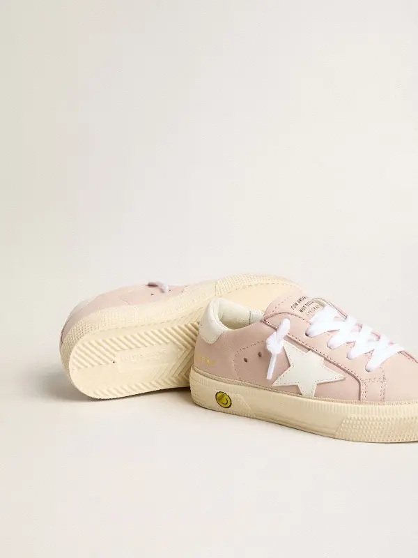 Seventies inspiration and a vintage feel meet the artisan craftsmanship typical of our sneakers. This Teen version of our May sneakers features a pale pink leather upper with white leather star and perforated worn-white leather heel tab. The smiley detail on the foxing completes the look.