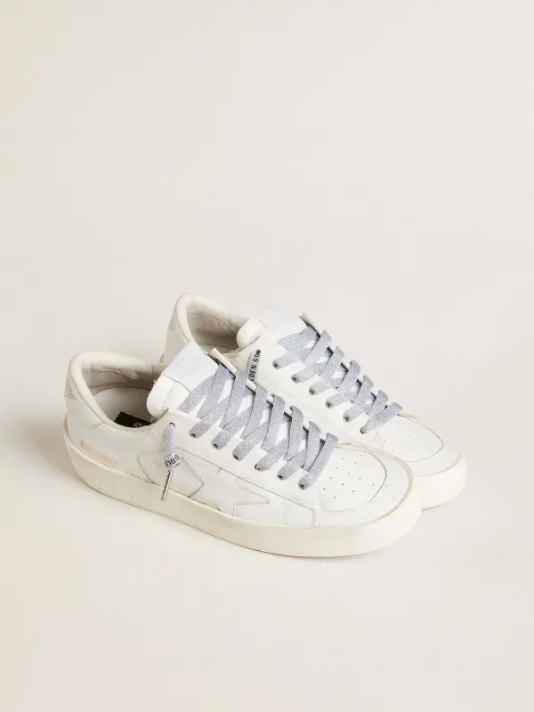 Silver-colored Lurex laces with contrasting black logo