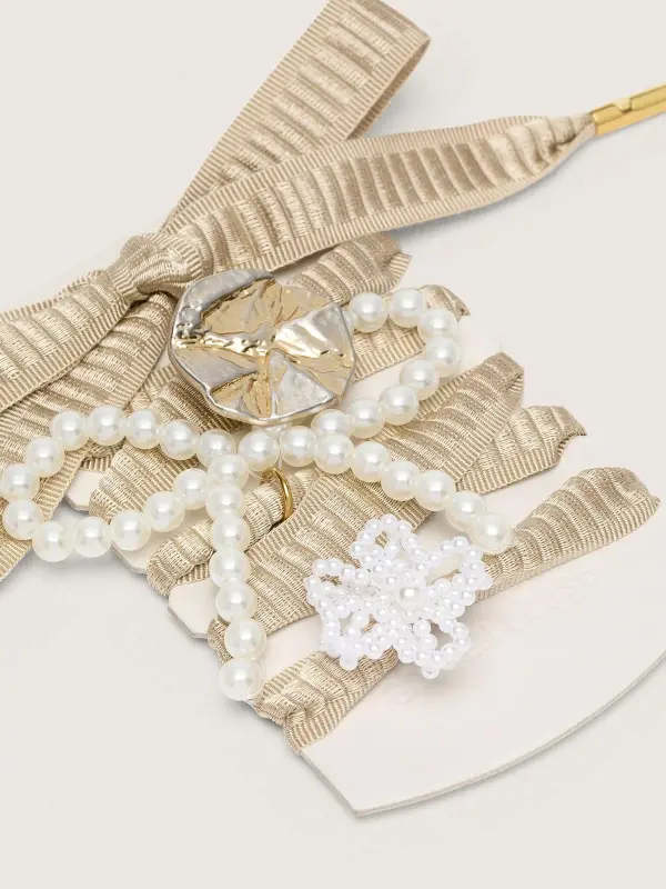 Customize your favorite sneakers with "Skins", our embellished laces, designed to express your unique style through accessories and colors that are sure to impress. This Sparkling model consists of a beige embroidered lace, embellished with two beaded charms, in the shape of a bow and a flower, accompanied by a distressed gold charm. The ideal accessory to let your personality shine.