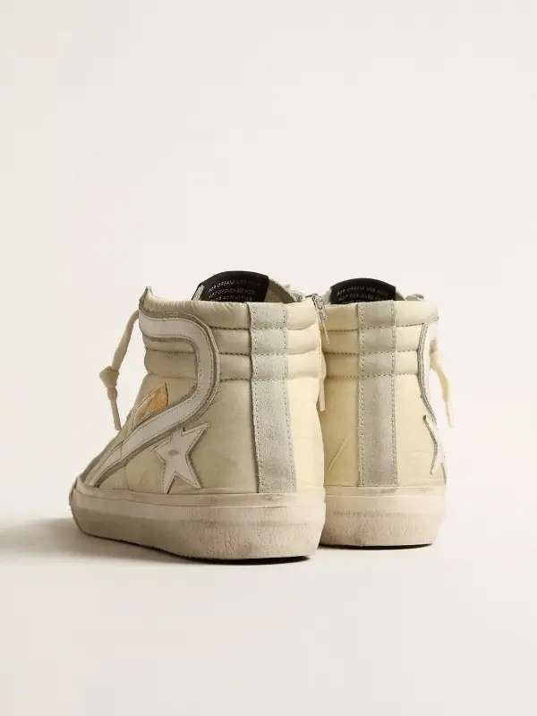 Skate soul, glamorous attitude. Our Slide sneakers take you straight to Venice Beach, between an ollie and a kickflip. With an ivory faded nylon upper and ice-gray suede inserts, this model features a white leather star and flash and an ice-gray suede heel tab. The tongue embellished with silver Swarovski micro-crystals and the cream-colored laces complete the look.