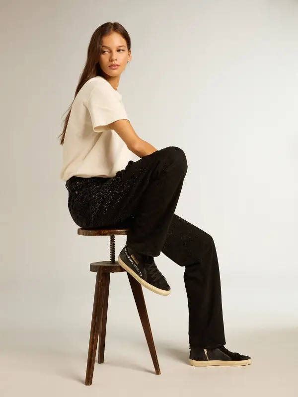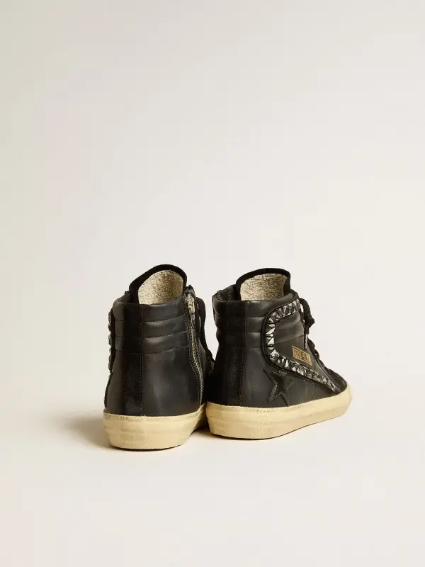 Skate soul, glamorous attitude. Our Slide sneakers take you straight to Venice Beach, between an ollie and a kickflip. With a black leather upper, this model features a glossy black leather star and inserts in black suede, such as the heel tab and tongue. A flash embellished with black Swarovski crystals and black leather trim and black laces complete the look.