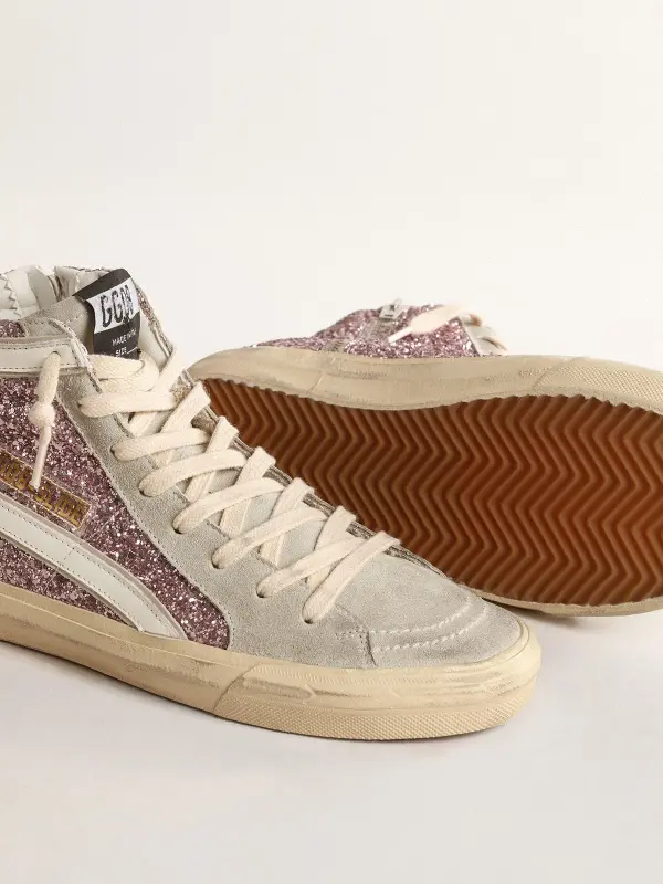 Skate soul, glamorous attitude. Our Slide sneakers take you straight to Venice Beach, between an ollie and a kickflip. This model with a lilac glitter upper features a white leather star and a sand-colored leather heel tab. The double flash in white leather and sand-colored leather, ice-gray suede tongue, and cream-colored laces complete the look.
