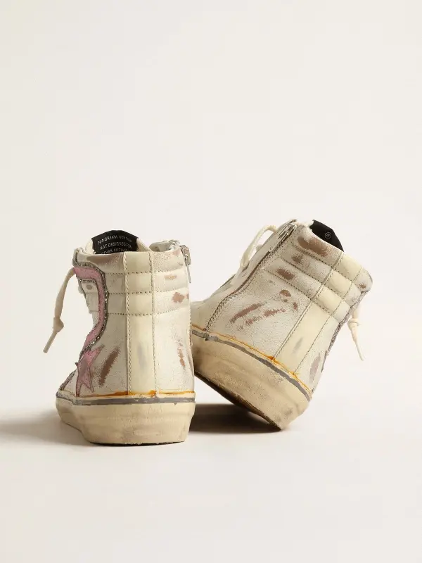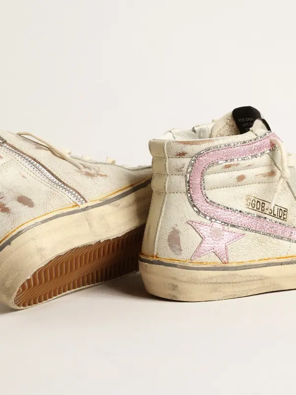 Skate soul, glamorous attitude. Our Slide sneakers take you straight to Venice Beach, between an ollie and a kickflip. This model with a beige leather upper features pink metallic leather inserts, such as the star and flash, edged in silver. The ivory leather heel tab, ice-gray suede inserts and tongue and cream laces complete the look.