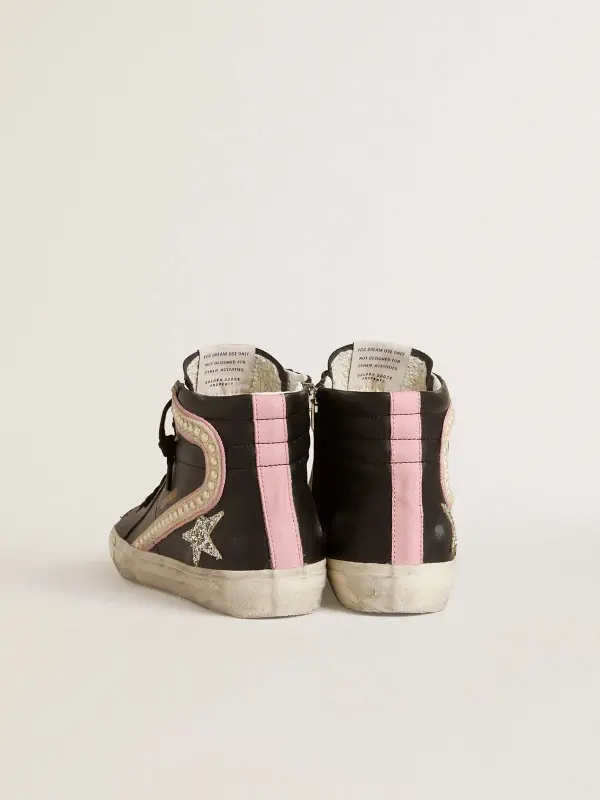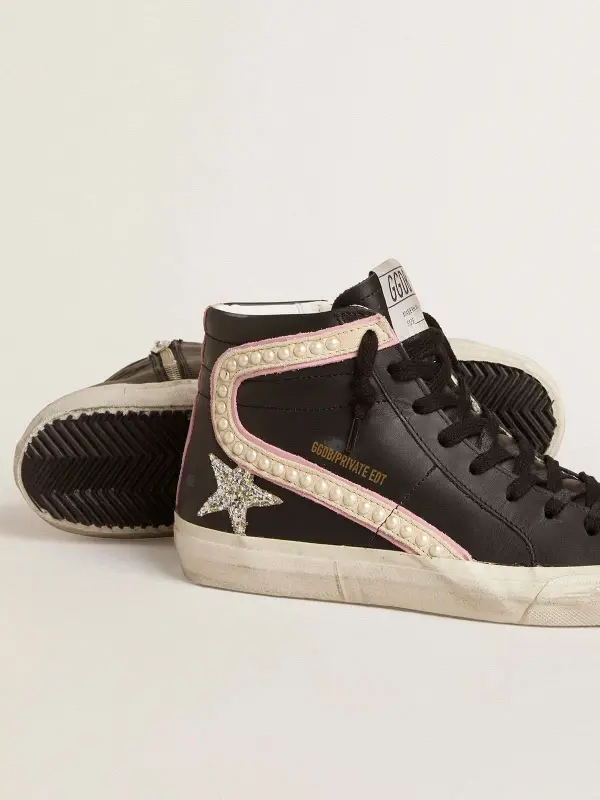 Skate soul, glamorous attitude. Our Slide sneakers take you straight to Venice Beach, between an ollie and a kickflip. This model with a black leather upper features a platinum glitter star and an old rose leather heel tab. The beige suede flash with old rose trim illuminated by white pearls and black laces complete the look.