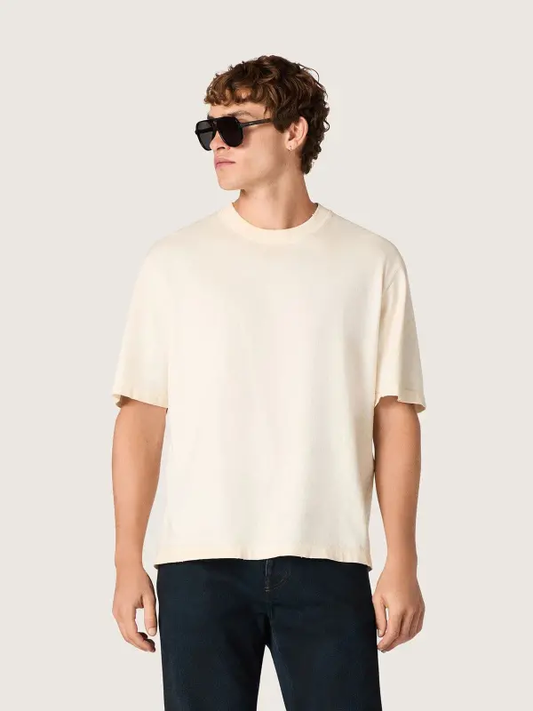 Made of vintage white cotton, this unisex T-shirt stands out for its lived-in treatment, the appliqué double star on the back and the contrasting black 'Star' print also on the back.