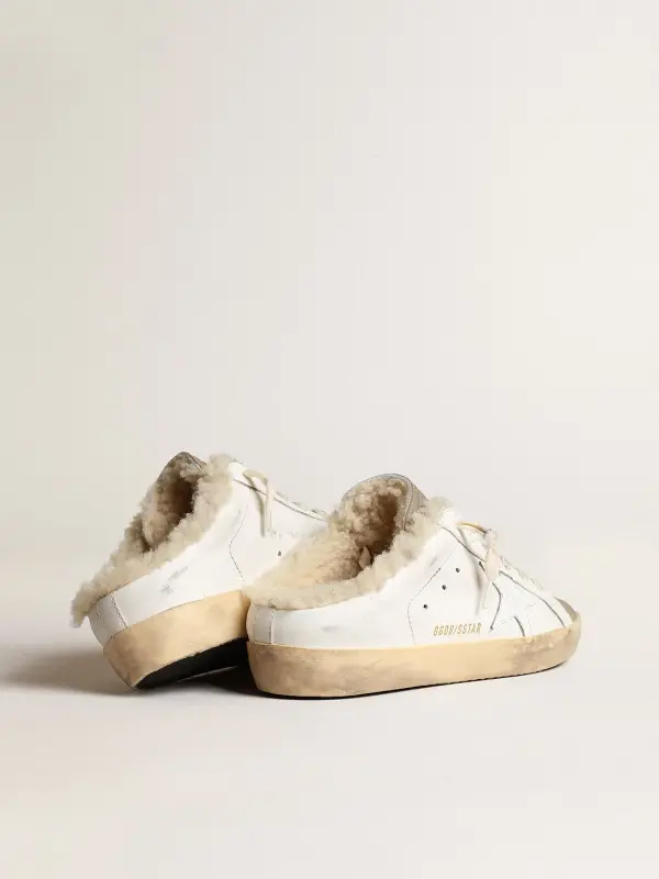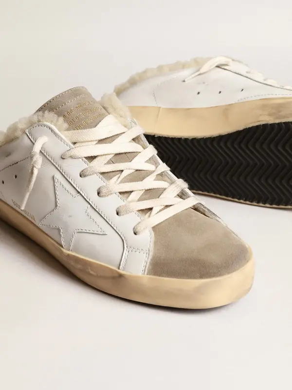 A timeless icon yet one that’s constantly evolving. At Golden, we love taking our classics and reworking them all the time, always from a new angle. Lined in soft beige shearling, this sabot version of our Super-Star sneakers in white leather features a glossy white leather star and a dove-gray suede tongue. And cream-colored laces add the finishing touch.