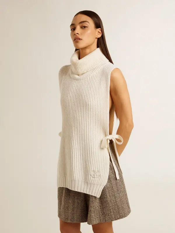 Unisex white high-neck sleeveless sweater in ribbed wool