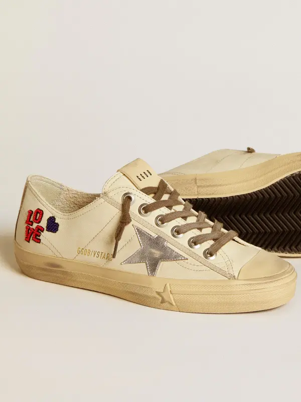 Beauty that lies in simplicity: in our V-Star sneakers, an essential shape meets stylish detail. This model with an ecru-colored nappa leather upper features a metallic silver nappa leather star. The word LOVE embroidered in red and blue beads and brown laces add the finishing touch.