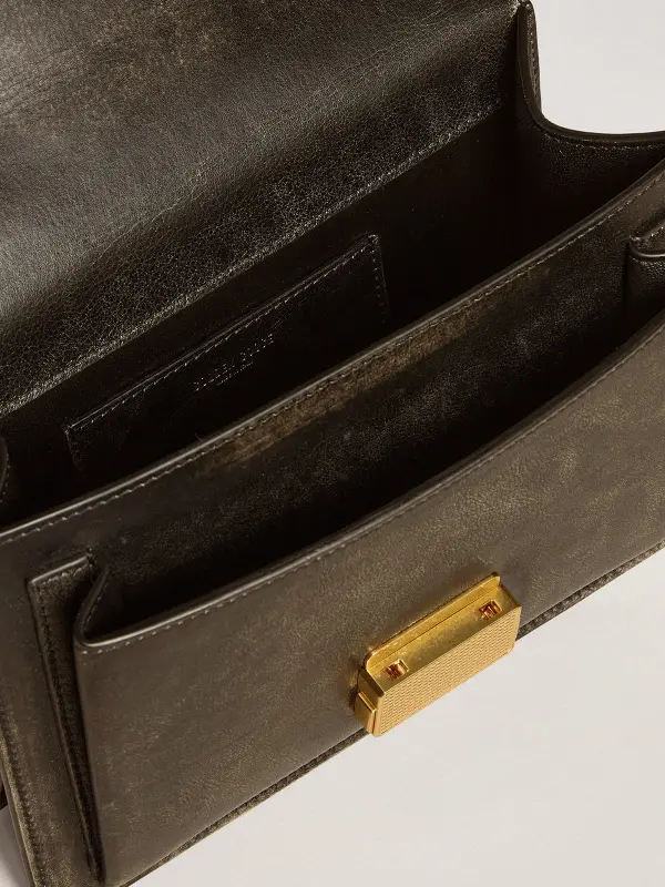 Functional yet sophisticated, our Venezia bag is a statement of Venetian elegance, inviting you to carry a piece of its soul wherever you go. In black distressed leather, this model features a gold-tone buckle closure and gold-colored metal detailing. The double inside pocket adds the finishing touch.