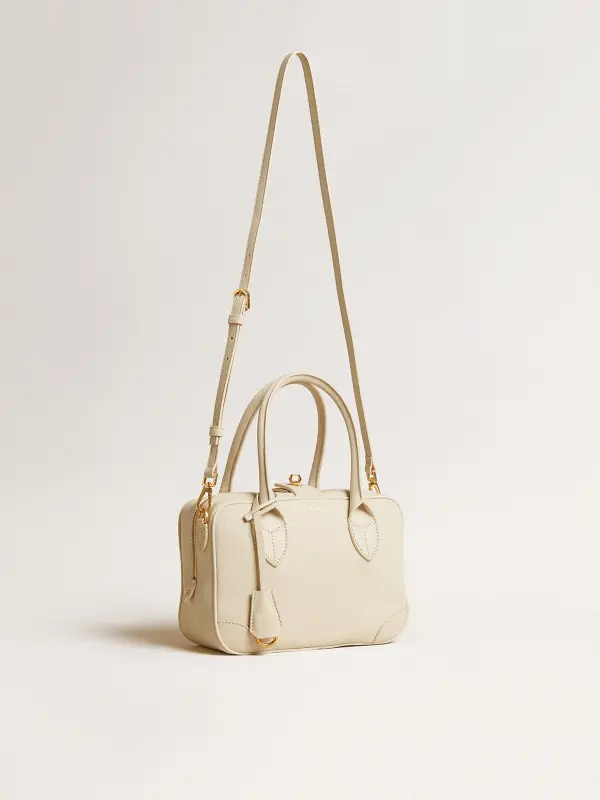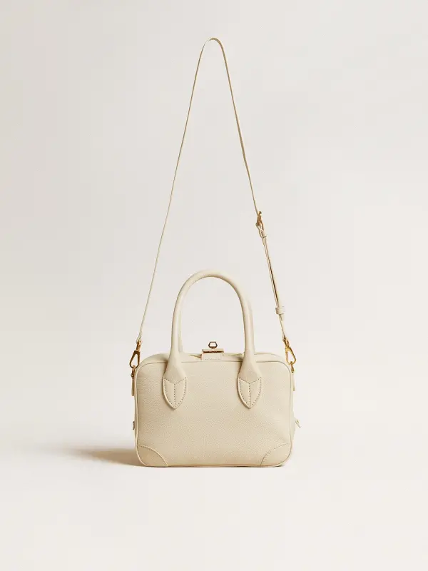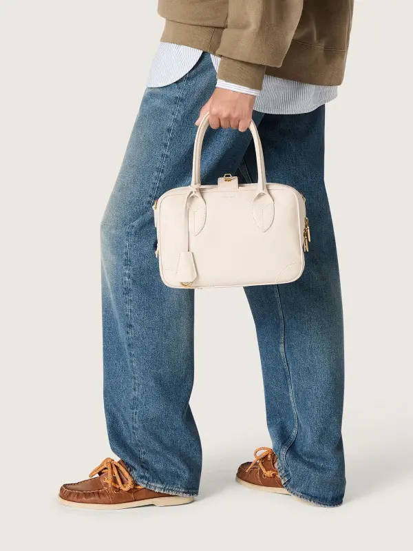 Our Vita Bag is a tribute the triumphant epoch of La Dolce Vita and its aesthetic codes, speaking to the wanderlust of the refined traveler. In butter-colored sheepskin leather, this model features a double closure: a double-pull zip and a golden key. The gold logo printed on the front and the snap hook enclosed in a leather case on the outside add the finishing touch.