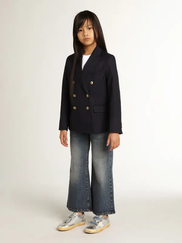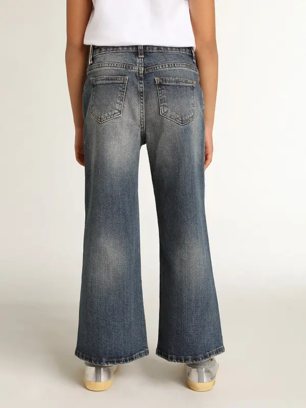 These oversized-fit, 5-pocket girls’ jeans in mid-blue bull denim feature a mid-low rise waist and a wide leg.