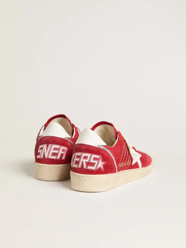 Dreaming of the Eighties. Our Ball Star sneakers have an American college vibe caught between a hoop shot and a skateboard ride. This version with a red suede upper features a white leather star and heel tab. Silver-colored glitter piping and cream-colored laces add the finishing touch: beautiful things that never go out of fashion.