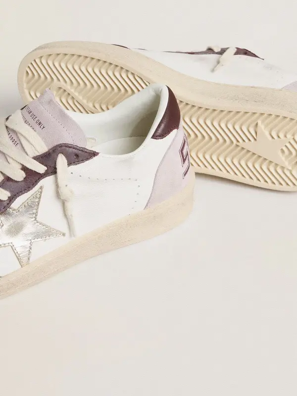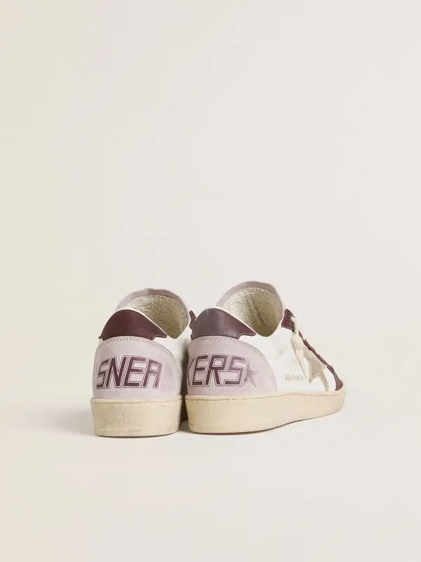Dreaming of the Eighties. Our Ball Star sneakers have an American college vibe caught between a hoop shot and a skateboard ride. Like this model crafted in white nappa leather with pink suede inserts, featuring a platinum foiled leather star and burgundy nubuck leather heel tab. The worn-white laces and the Sneakers writing on the heel in a burgundy "heavy metal" font add the finishing touch: beautiful things that never go out of fashion.