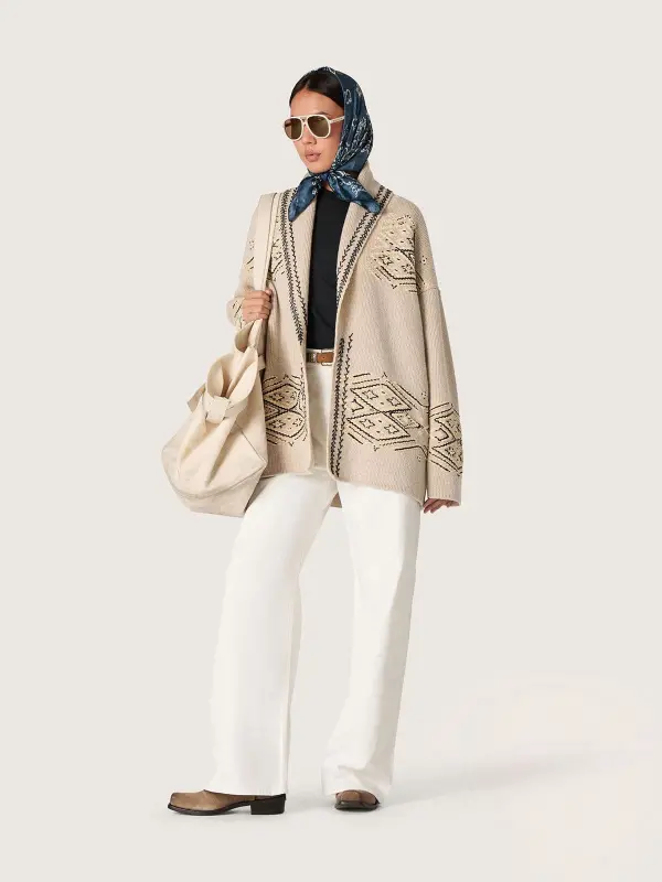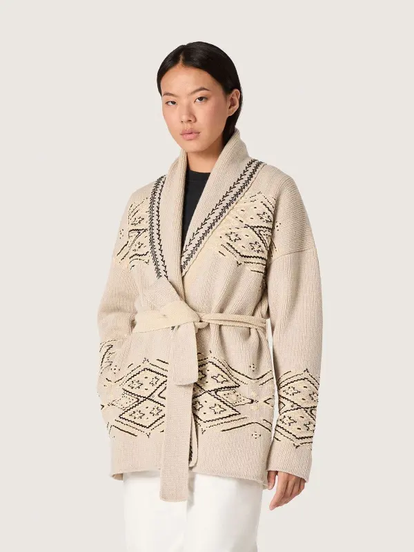 Women’s belted cardigan in beige wool blend with contrast embroidery