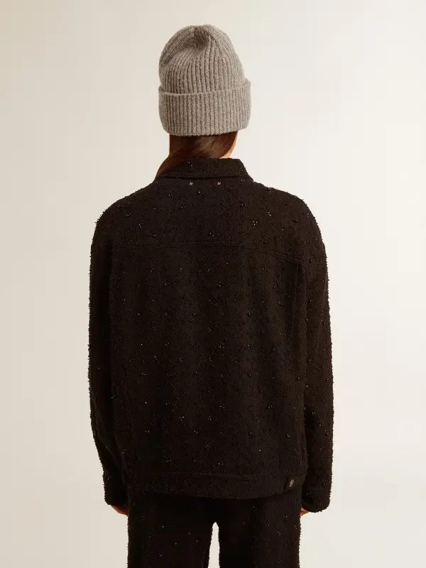 A love story to our home, Marghera. Where everything began. Our latest collection reflects the spirit of our birthplace, its contrasts, industrial soul, and manufacturing landscapes, weaving together inspirations from both the vibrant energy of workwear and the refined essence of traditional tailoring. In black bouclé cotton denim, this women’s jacket features laser embroidery and matching crystals and pearls in different sizes. The two pockets with button fastening on the front add the finishing touch.