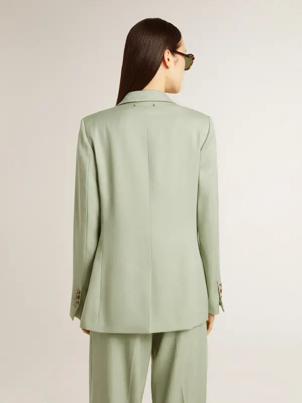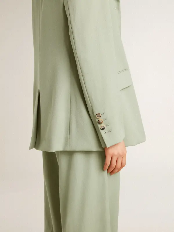 Embracing the essence of the season, this collection radiates vitality and freedom, combining airy elegance with dynamic sparks of energy. This women's blazer in sage-green pure virgin wool features peak lapels and a slim fit. The closure with three logoed horn buttons, the printed lining and the two pockets are the finishing touches that make this jacket unique and inimitable.