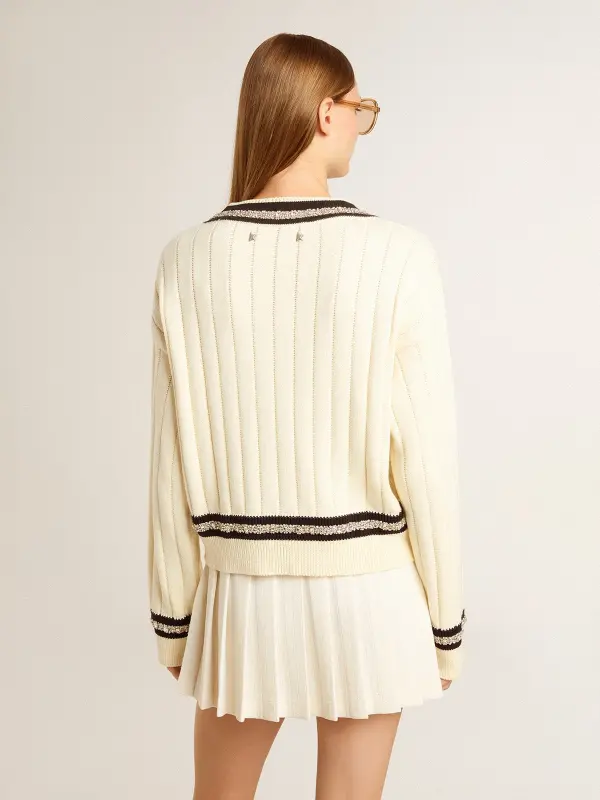 Inspired by the electric energy of the Nineties, the collection celebrates the limitless power of shared dreams. Moved by passion, each design captures the meaning of togetherness and the power of music. In distressed white cotton, this cropped V-neck sweater features blue striped ribs with crystals. The cable pattern and two stars on the back add the finishing touch.