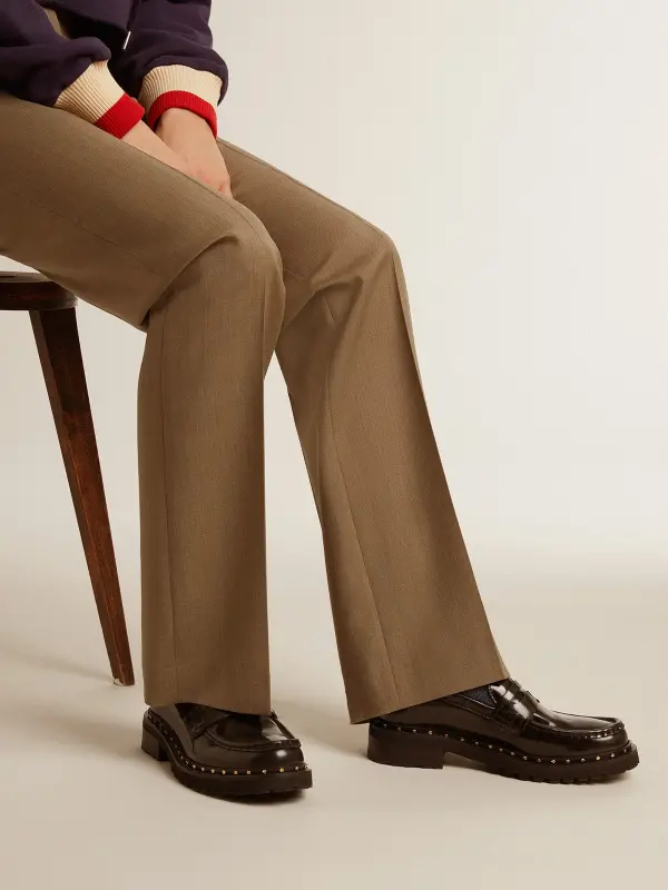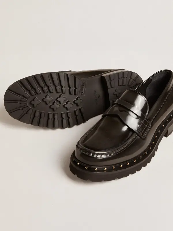 A timeless classic reworked in Golden style: Chunky boldly reinterprets the evergreen silhouette of the loafer. This version features a black leather upper and the addition of contrasting gold studs.