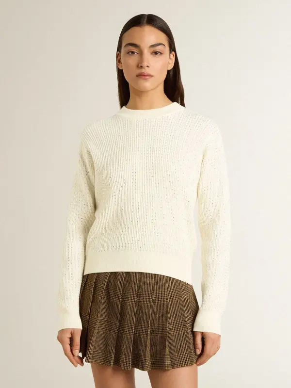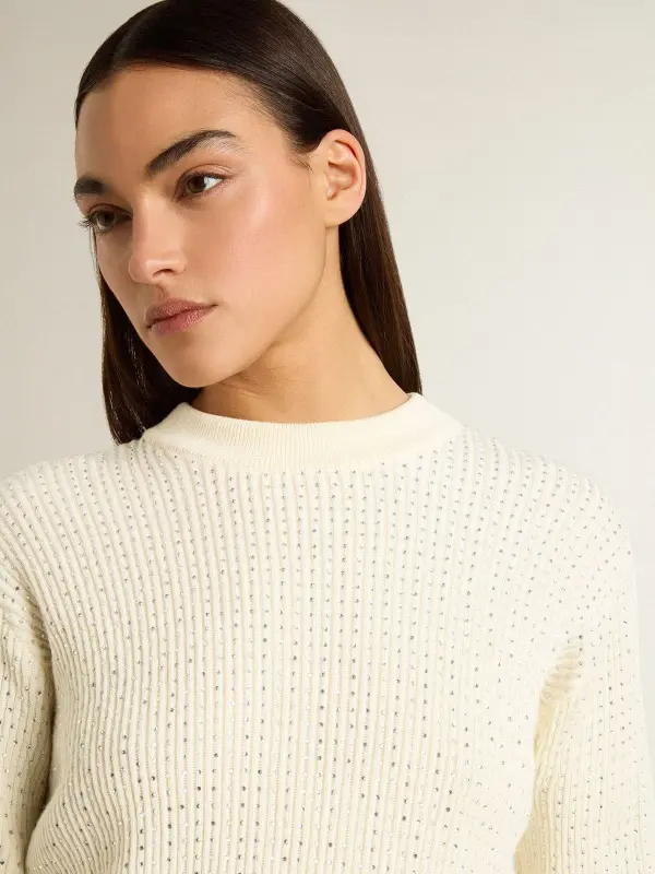 Women’s crew-neck sweater in white merino wool with all-over crystals