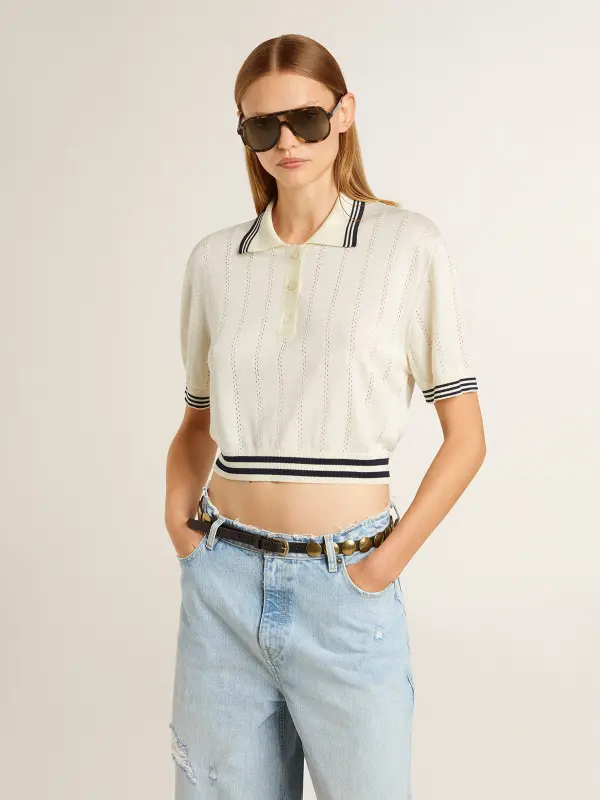Women’s cropped worn-white cotton polo shirt with blue ribbing