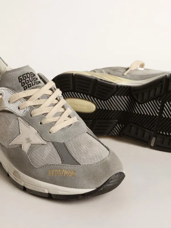A soul with a wealth of stories to tell: our Dad-Star sneakers have timeless style, created to be passed down through the generations. With an abundance of sophisticated details, this version features a gray suede and pale silver mesh upper with white leather star and heel tab. The reflective fabric inserts, silver eyelets and cream-colored laces add the finishing touch.