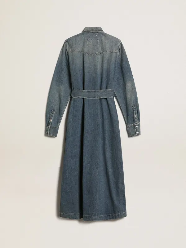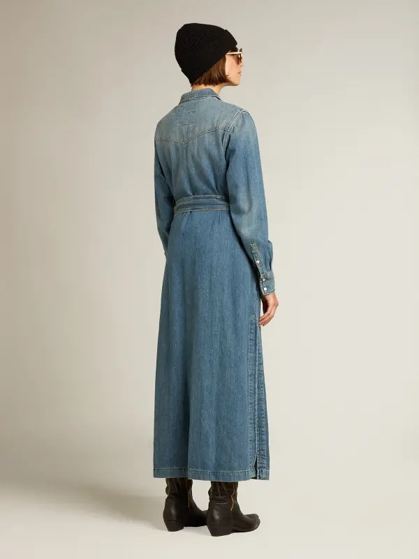 A unique, timeless collection that encompasses the essence of Golden Goose, designed to remain with you every day and accompany your highs and lows, come rain or shine. This medium-wash denim shirt dress features a tone-on-tone belt at the waist and side slits.
