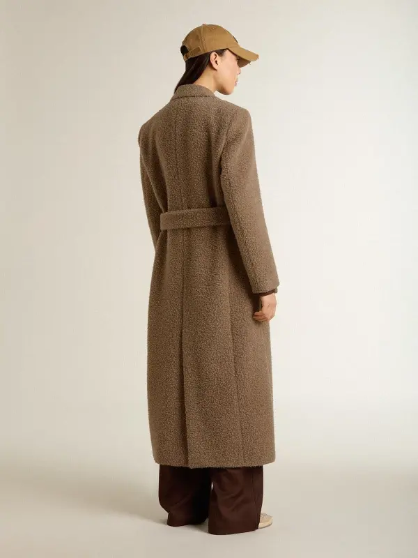 The second drop in the Fall/Winter 25 collection unfolds like a relaxed and refreshing journey, woven into the fabric of each and every piece. This double-breasted coat in a beige wool blend features a brown button fastening, two front pockets and a belt at the waist.