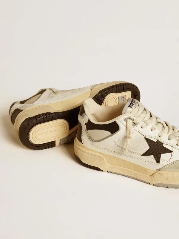 Inspired by the glory days of American basketball, the Forty2 sneaker channels the evergreen charm of the 1990s. Its chunky low-top silhouette and sporty design evoke a legendary journey, celebrating the indomitable spirit of the eternal dreamer. With its unique handcrafted construction and micro-perforated inserts, this women’s version in white leather features details with a 3D textured effect, such as the black TPU star and black leather insert on the back, and a black leather heel tab. The gray piping, ice-gray suede toe and vintage-effect white laces add the finishing touch.
