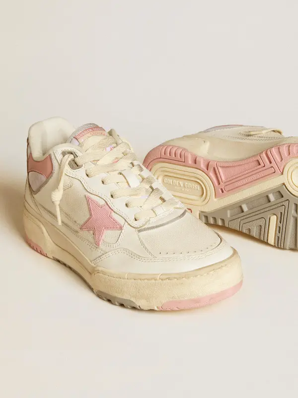 Inspired by the glory days of American basketball, the Forty2 sneaker channels the evergreen charm of the 1990s. Its chunky low-top silhouette and sporty design evoke a legendary journey, celebrating the indomitable spirit of the eternal dreamer. With a unique handcrafted construction and micro-perforated inserts, this women’s version in worn white leather features details with a 3D textured effect, such as the pink TPU star and pink leather insert on the back, and a white leather heel tab. The gray piping and cream-colored vintage-effect laces add the finishing touch.