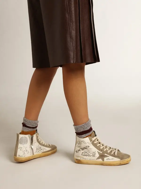 The Seventies, today: inspired by the world of basketball, the style of the Francy sneakers is updated with unexpected details and special finishes. This women’s model with a white nappa leather upper features dove-gray suede details such as the heel tab and tongue, and a mismatched star: in dove-gray suede on the right sneaker and dove-gray and black screen-printed suede on the left. The all-over black lettering on the upper and cream-colored laces complete the look.