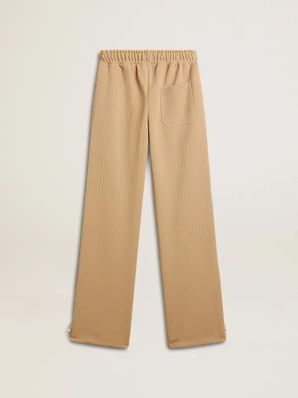 A collection with a casual soul but a versatile attitude: inspired by the Seventies, it has a timeless vintage appeal, suited to any occasion or look. These loose-fit women’s joggers in pinstripe light beige technical jersey feature pinstripe rib knit and adjustable elastic at the ankle. The logo print on the left leg and the two pockets on the front complete the look, along with the back pocket.