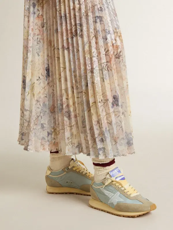 Track and field-inspired, with a Seventies flair. Day after day, our new Marathon sneakers are designed to keep you running after your dreams, paying homage to the marathon that is life. This women’s model features a nylon upper, a pastel blue star, a gold metallic nappa leather heel tab and a gray suede toe. The look is completed by white laces with a lived-in look and a starred outsole, to make a truly unique impression.