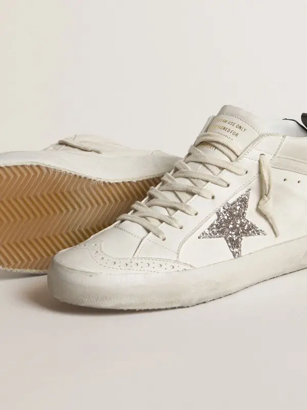 Uniquely elegant versatility: the Mid Star sneakers take a refined approach to their Nineties skate scene inspiration. Like this model with a white nappa leather upper, featuring a silver glitter star and a black laminated leather heel tab. And white laces add the finishing touch.