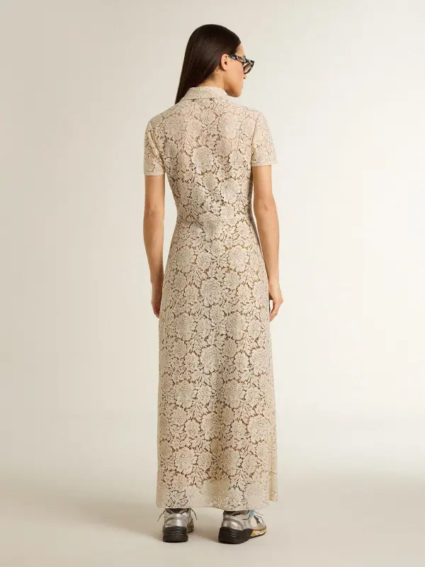 Inspired by the iconic Seventies, the carefree spirit of that era comes to life with the first drop of our Fall/Winter 25 collection. This cream midi dress features an all-over floral pattern in a see-through effect lace. The short sleeves and neckline with four antique gold buttons add the finishing touch.