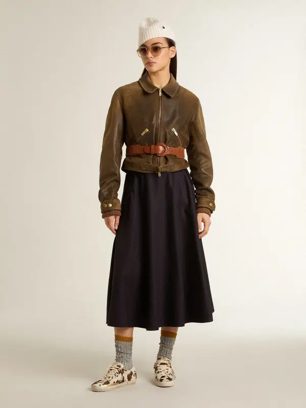 The third drop in our Fall/Winter 25 collection channels the funky glamor of the 1970s, a time when the night transformed into a canvas for unapologetic self-expression. This women’s midnight blue wool midi skirt features thin vertical stripes and two front patch pockets. The elasticated waistband and double star on the back add the finishing touch.