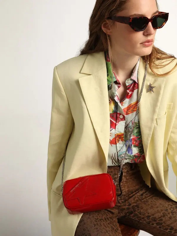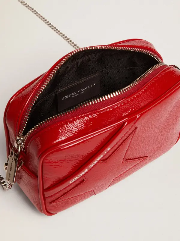 Vintage inspiration, metropolitan attitude. A versatile accessory that captures the classic design of camera bags and stands out thanks to its refined details – now also in a mini version. This model, in naplak-effect red patent leather, features a tone-on-tone star. The silver-colored shoulder chain with Dreaming lettering and the contrasting silver logo that decorates the front complete the look.