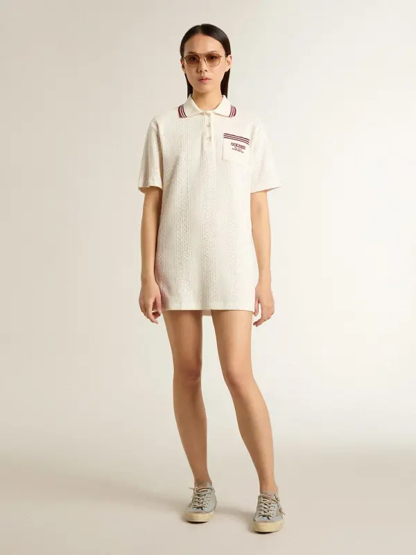 Made of white perforated cotton jersey, this women's polo dress channels a retro sports aesthetic with distinctive details such as the collar with burgundy stripes and the coordinated pocket with "Mediterraneo" embroidered patch. The two gold stars on the back complete the design with the unmistakable Golden touch.