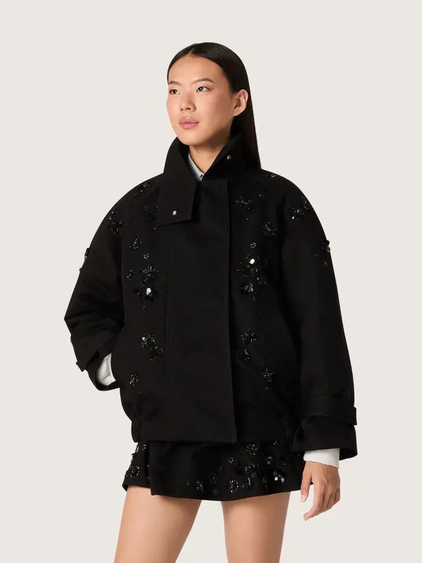 Women’s oversized jacket in black cotton twill with floral sequin embroidery