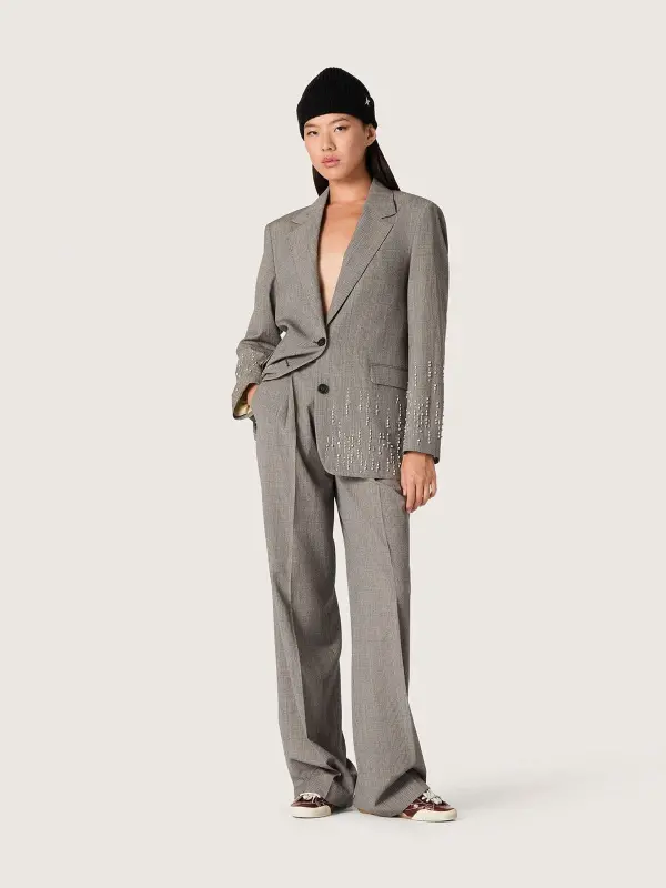 A timeless classic in the female wardrobe: these oversized-fit pants in gray Prince of Wales check fabric feature two pockets on the front and an internal front fastening with a hidden button, metal hook and zip. The welt pocket on the back and the iconic silver stars complete the look.