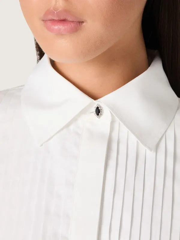 Made of white cotton poplin, this women's shirt features an oversized fit accentuated by a pleated bib on the front and jeweled cuffs. The concealed effect fastening with mother-of-pearl buttons complemented by a jewel button on the collar for a distinctive accent, and the iconic double star on the back complete the look.