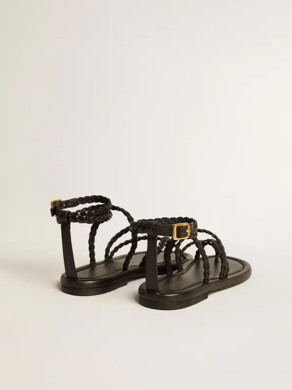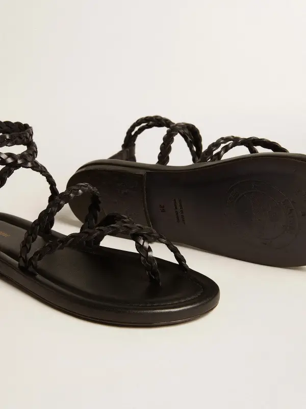 This women's version features braided and crossover straps in black leather and a fastening with an antique gold color buckle. The black leather sole completes the look.