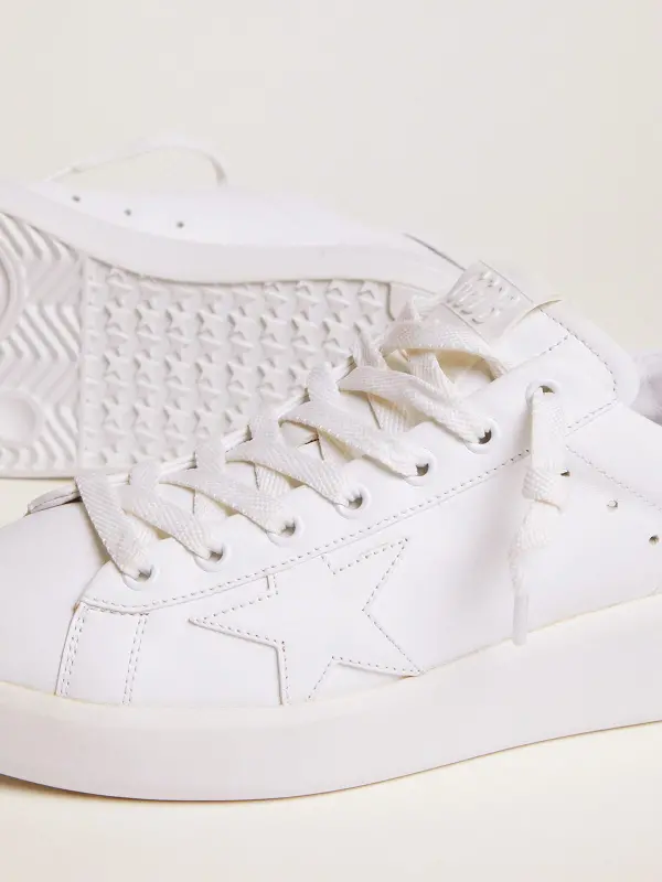 When the minimalism of the shape meets the strength of the details: our Purestar sneakers combine an understated style with extreme comfort thanks to their shock-absorbing technology. This white leather model features a tone-on-tone leather star and a silver micro-glitter heel tab. The white laces complete the look.
